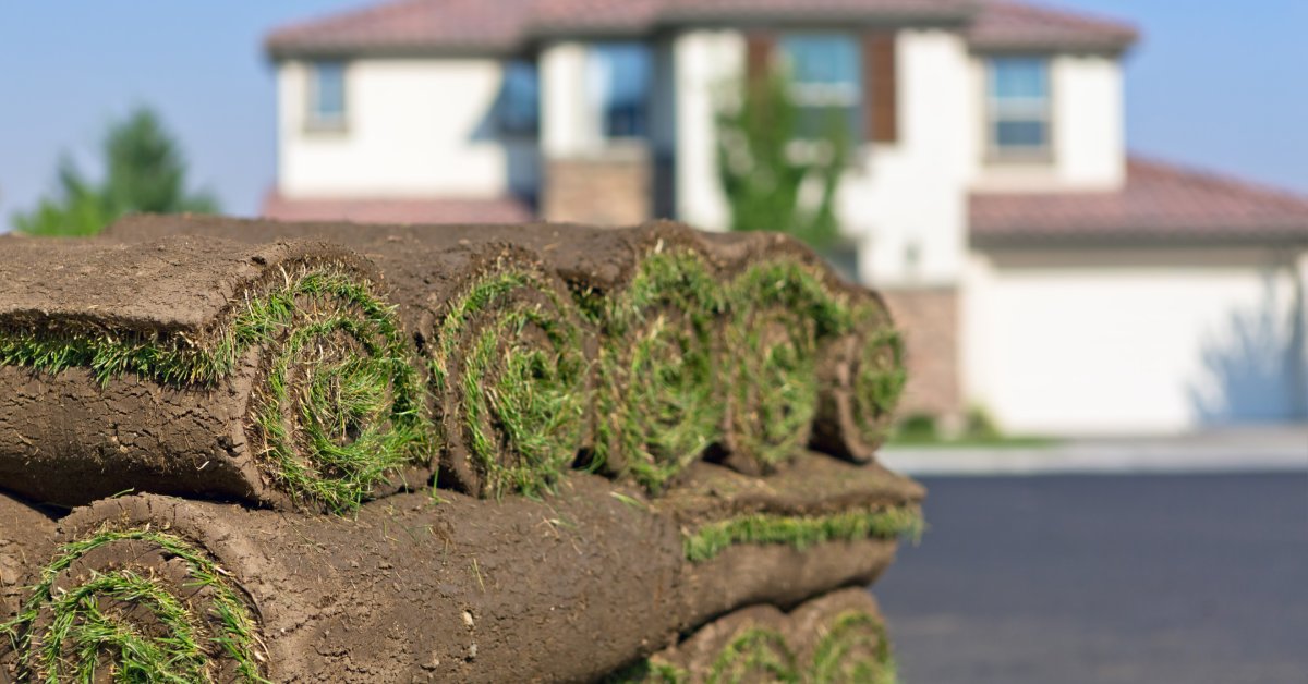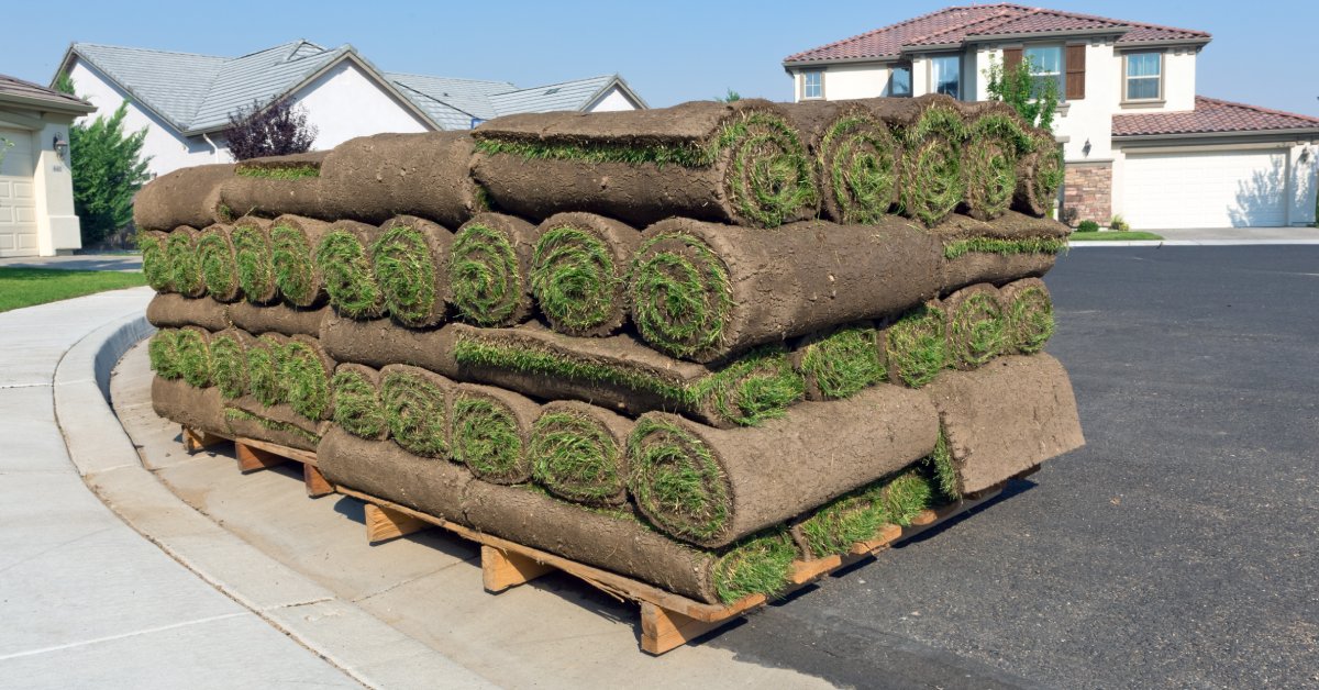 Close-up of several stacks of rolled sod that have been delivered to a project site, with a large house in the background.