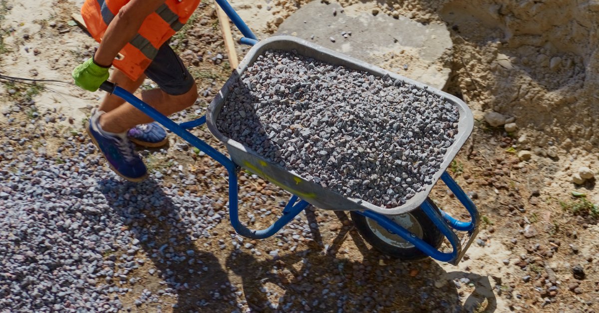 A man in a high-visibility orange vest pushes a wheelbarrow full of small landscaping rocks at a project site.