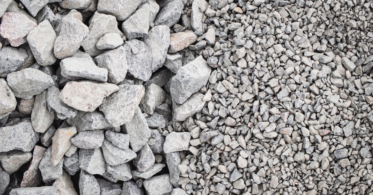 Close-up of a pile of larger landscaping stones next to a pile of smaller, pebble-sized landscaping stones.