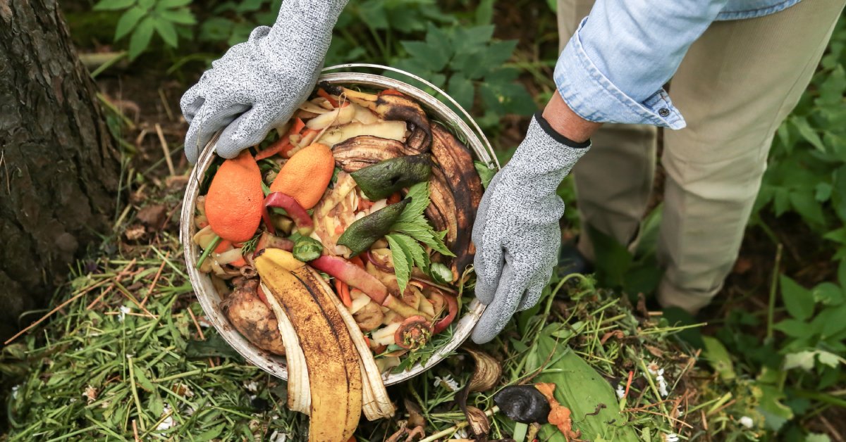 A gardener placing a bowl of food scraps into their existing compost pile outdoors. The scraps include bananas and oranges.