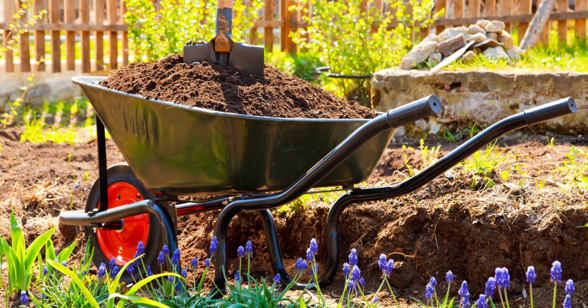 A sunny day in the garden with a wheel barrel in the middle of planter boxes. The wheel barrel is full of compost.